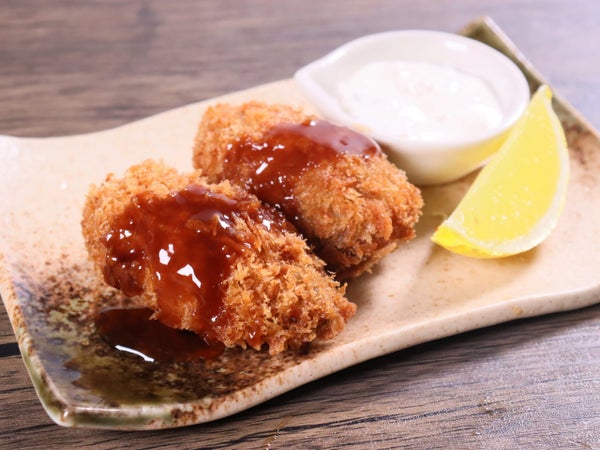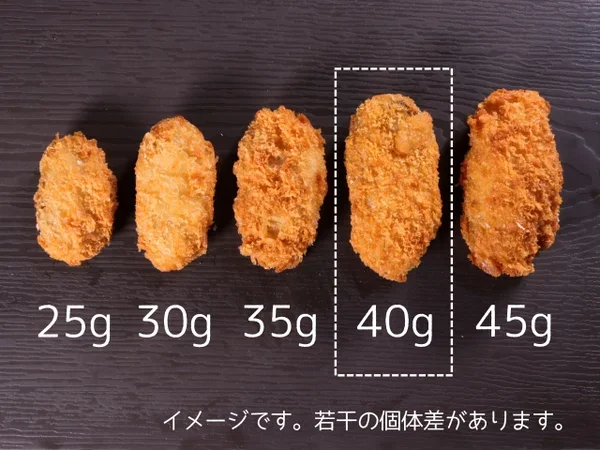 韓国産かきを使用した大粒かきフライ。長さ約8cm・太さ約4cm。(個体差があります)