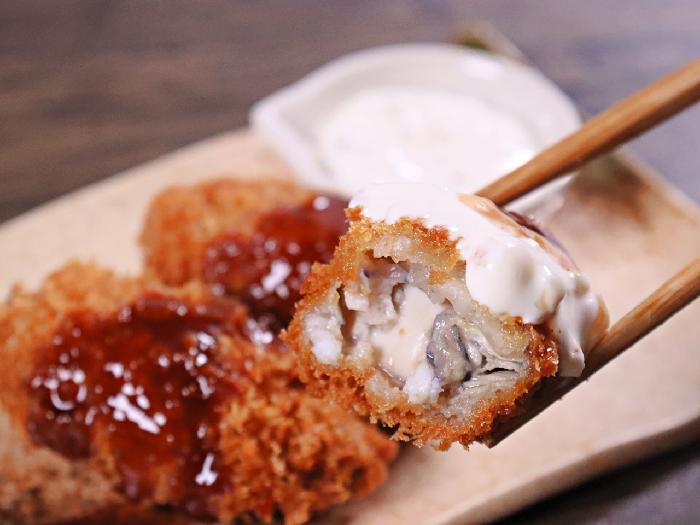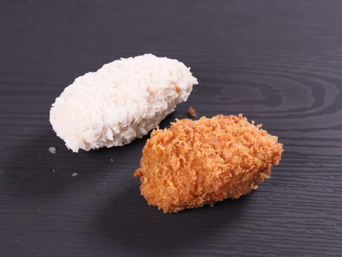 韓国産かきを使用した大粒かきフライ。長さ約8cm・太さ約4cm。(個体差があります)