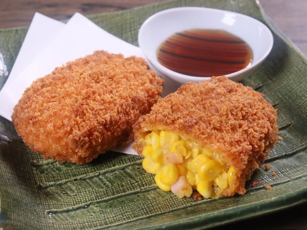 ほろほろとあふれ出す粒コーンにチョップドハムが入ってうまみを加えています。コーンの「塊」をサクサクの衣で味わうメニューです。