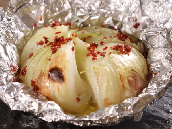 ラップで包んでレンジ加熱後、アルミにくるみ焼き台で焼き目をつけました。とろっとした甘味があります!