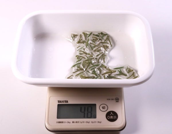 水を切って計測しました。内容量としては約50g程度です。