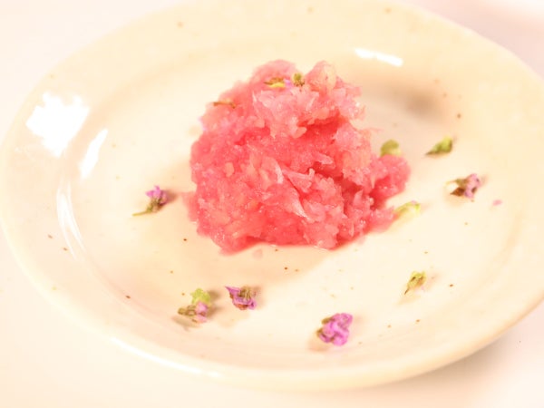 酢につけると、断面の「ピンク色」が「赤色」に変化します。上が酢水に1時間程度つけたもの、下段はそのままのものです。 ピンク色が料理に映えます。