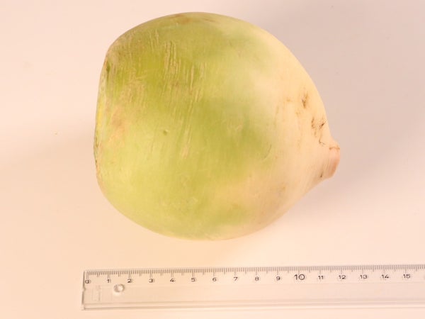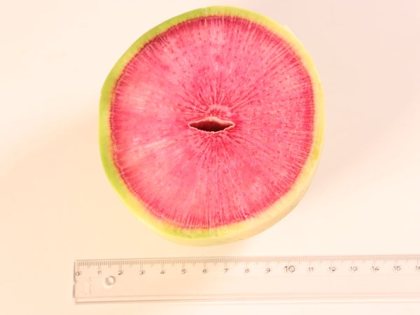 皮は青首大根のような緑色で、果肉は赤紫色をしています。辛みが少なく、シャキシャキとした食感です。生のまま、サラダや浅漬けなどにオススメです。