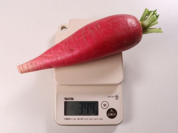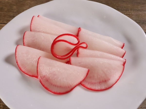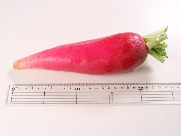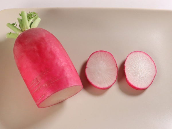 皮はピンク色、内側は純白です。サラダ用の大根として品種改良されているので、皮も一緒にお召し上がりいただけます。少し辛味があります。