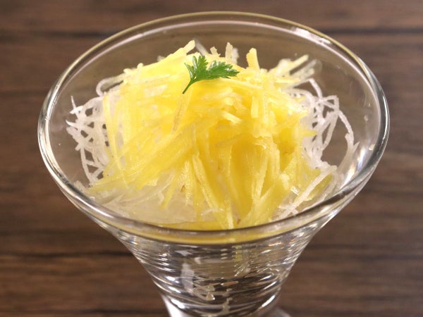 スライサーでスライスし、大根にのせました。モンブランケーキのような、可愛らしいサラダができます!