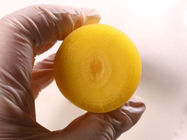 鮮やかな黄色が目を引きます。芯の部分も黄色みがあります。サラダやピクルスなど幅広い用途でご利用いただけます。本数はパックにより異なります。