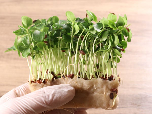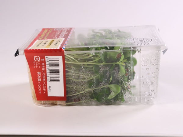 発芽したばかりのため、一部に種皮(茶色い殻)がついています。