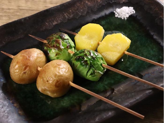 芽キャベツと、黄色人参と一緒に串焼きにしました。芽キャベツやペコロスと近しいサイズです。