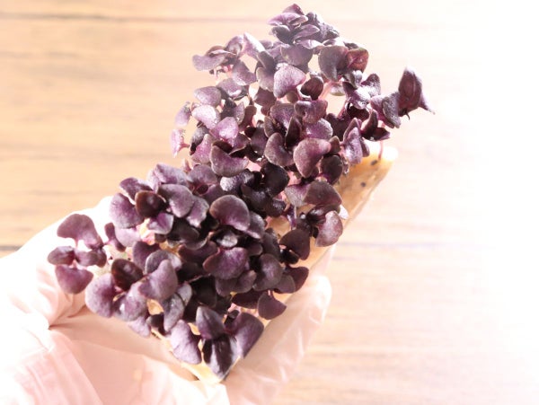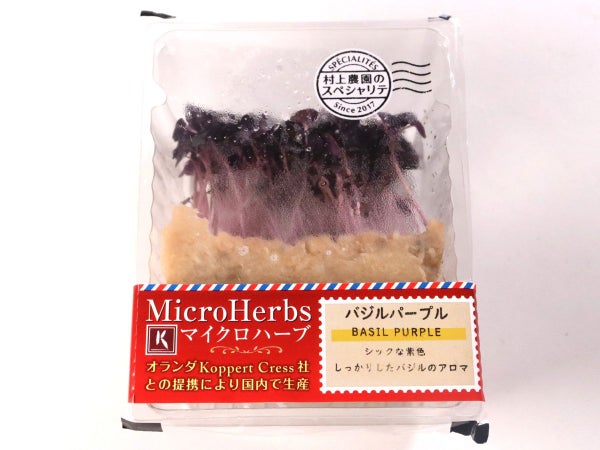 紫色のバジルで、葉の形は親野菜そのままの、かわいらしい形をしています。村上農園のマイクロハーブシリーズの1種です。