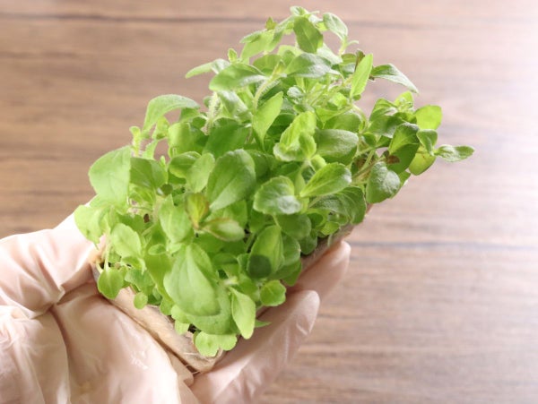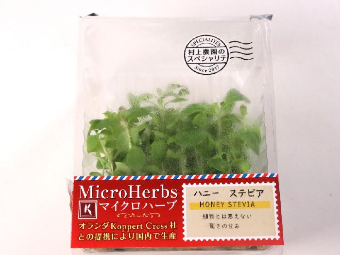 砂糖の200-300倍の甘さをもつ植物「ステビア」の若葉です。軽やかな甘みが口の中に広がります。 料理の仕上げに飾るだけで、料理のアクセントとして、お客様に新鮮な驚きと天然の甘さを提供できるハーブです。村上農園のマイクロハーブシリーズの1種です。