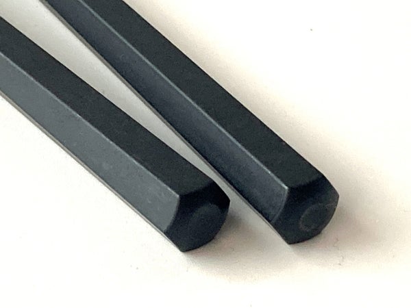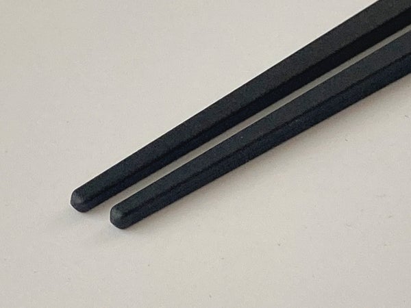 耐熱温度220℃で食洗機でも劣化しにくいリユース樹脂箸です。グリップ部は六角で持ちやすく、箸先は四角く食べやすい細さ。手元と箸先には、それぞれに適したすべり止め加工を施しています。上品なマット仕上げで適度な重みがあり、チープな印象を与えません。
