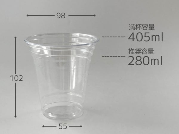 ドリンク用の14オンス透明カップです。推奨容量:280ml/満杯容量:405mlです。(推奨容量は飲料を提供に適したおすすめの容量です。あくまで目安としてお考え下さい。)