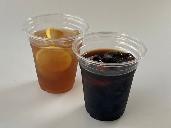 さまざまなドリンク提供に使える、汎用性の高いクリアーな透明カップです。薄手ながらも飲み口まわりや底部周辺に円周状の段をつけており、強度を高めています。