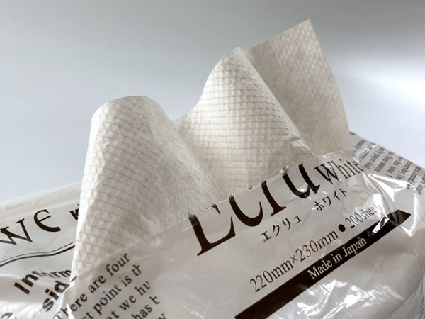 再生紙利用なのでナチュラルな生成り色。丈夫な紙質ですがゴワつきはなく、しっかり拭けます。