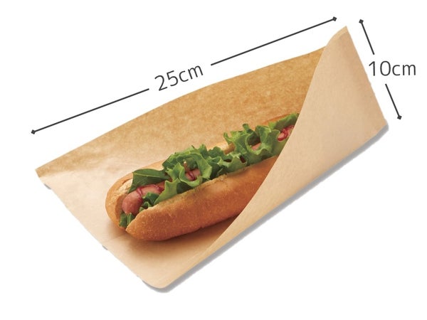 ホットドッグ用の四辺のうち二辺の口が開いたタイプの紙製袋です。内側はラミネート加工し、ソースなどが染みにくい仕様です。長さ18cm程度のバンズにちょうど良いサイズです。