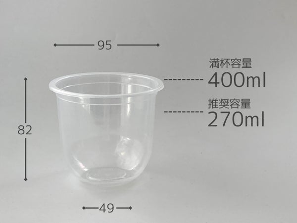タピオカドリンク・デザートなどにおすすめの、U型底の樽型クリアカップです。推奨容量:270ml/満杯容量:400mlです。(推奨容量は飲料を提供に適したおすすめの容量です。あくまで目安としてお考え下さい。)製造ラインの都合上、50個以上入っている場合があります。