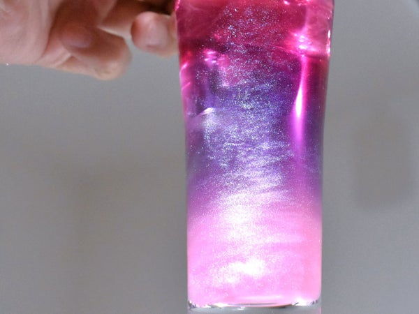 クリアな色のカクテルに利用すると、きらきら舞うパールパウダーが引き立ちます。(写真はバタフライピーシロップを合わせた夜桜カクテルです)