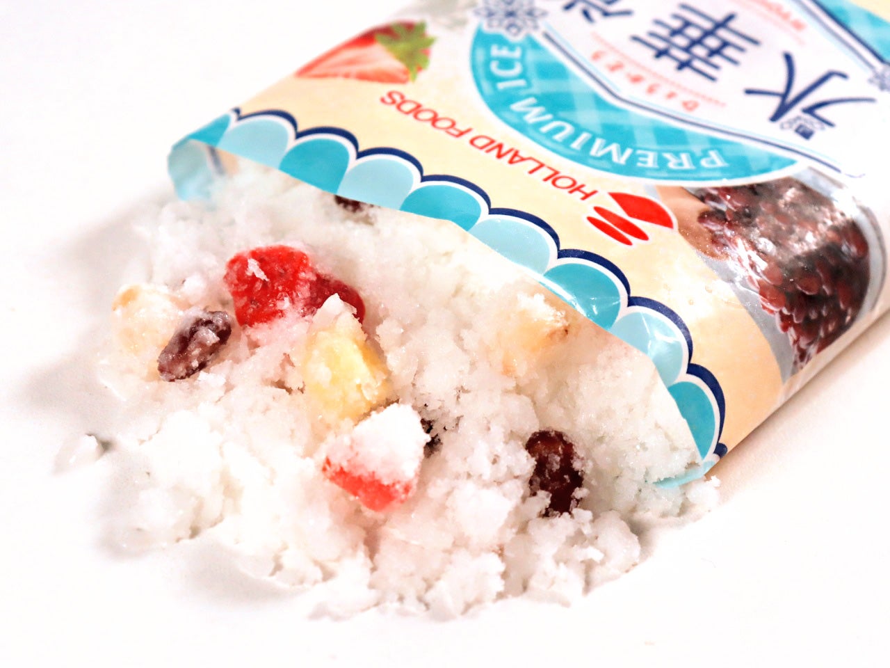 高度な製氷技術で作られたかき氷に、刻んだいちご果肉を混ぜ込みました。1袋100g。