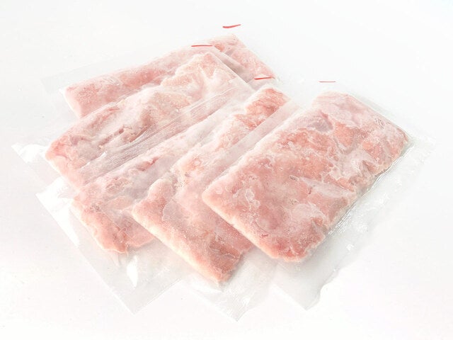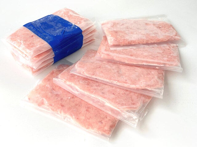 50gの少量パックです。薄い板状なのですぐ解凍できて、解凍直後からピンク色の発色がいい商品です。