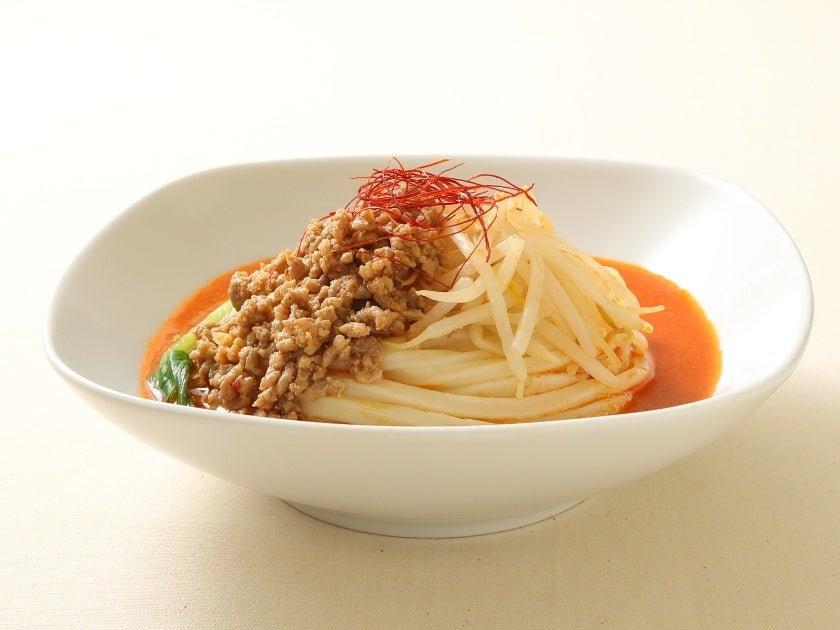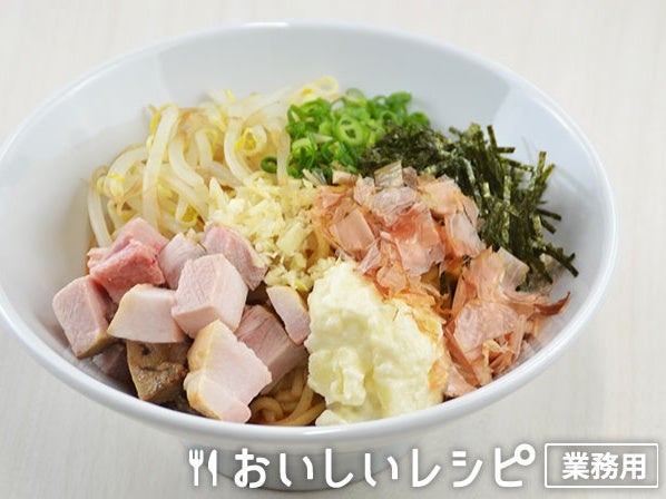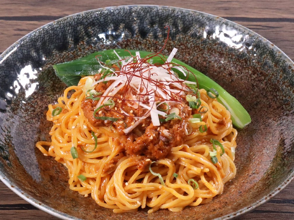 ピリ辛のゴマベースの担々麺つゆを薄めずにマヨネーズと混ぜ合わせ、たっぷりの具や薬味と和える冷しまぜそばです。ボリュームと食べ応え満点の1品です。