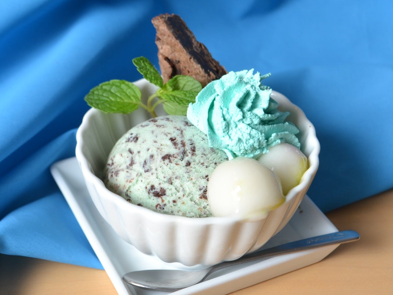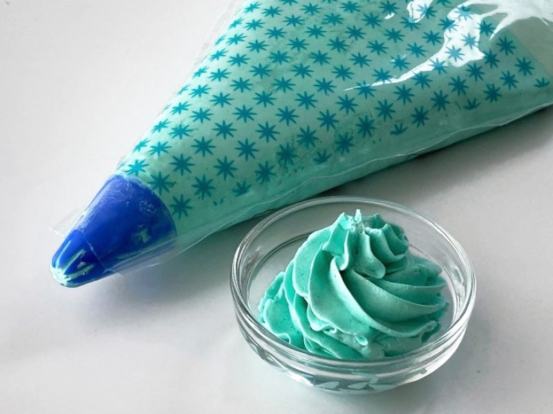 ペパーミント由来の香料を使用した、清涼感のある青色のホイップクリームです。口金つき絞り袋タイプです。