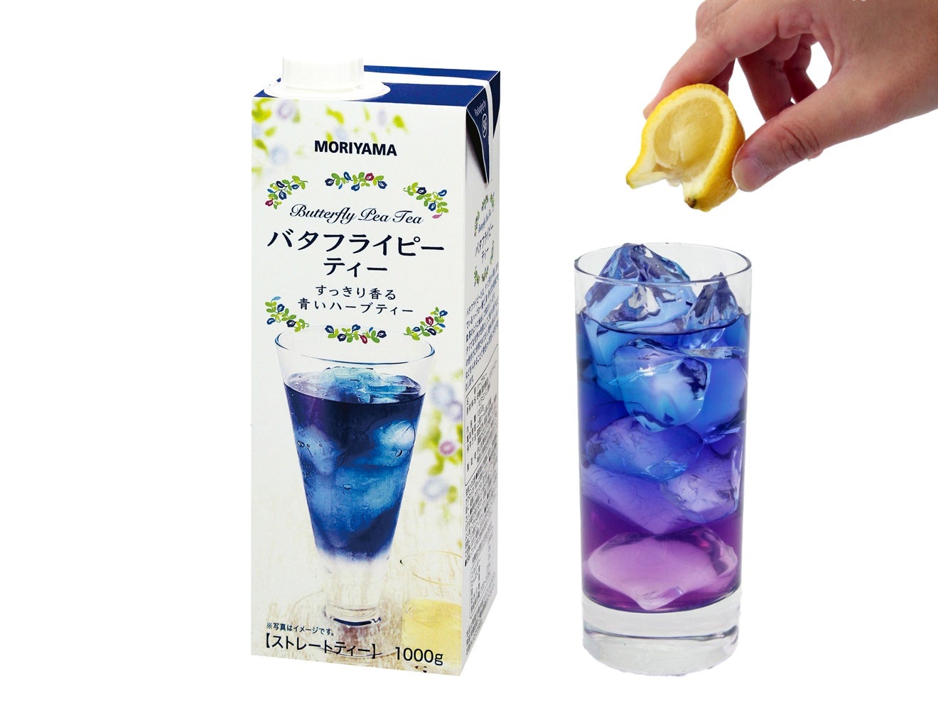 ハーブの一種バタフライピーの花を乾燥させ、紅茶の様に抽出した鮮やかな青いストレートティー。レモン果汁など酸味を足すと紫色に変わる神秘的な飲料です。