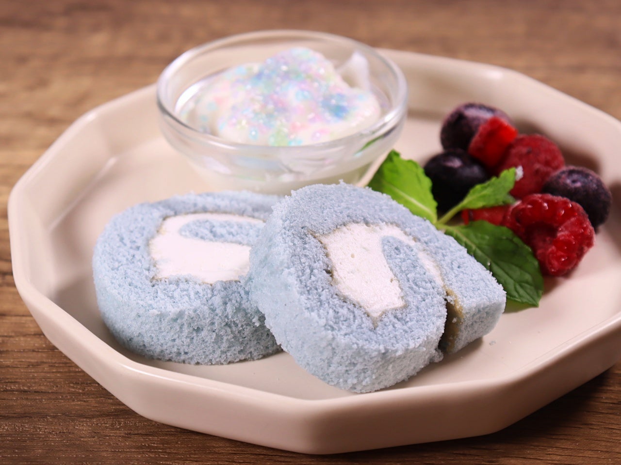 スイーツや料理にあまりない、水色のロールケーキです。推し色スイーツにぜひお使いください。
