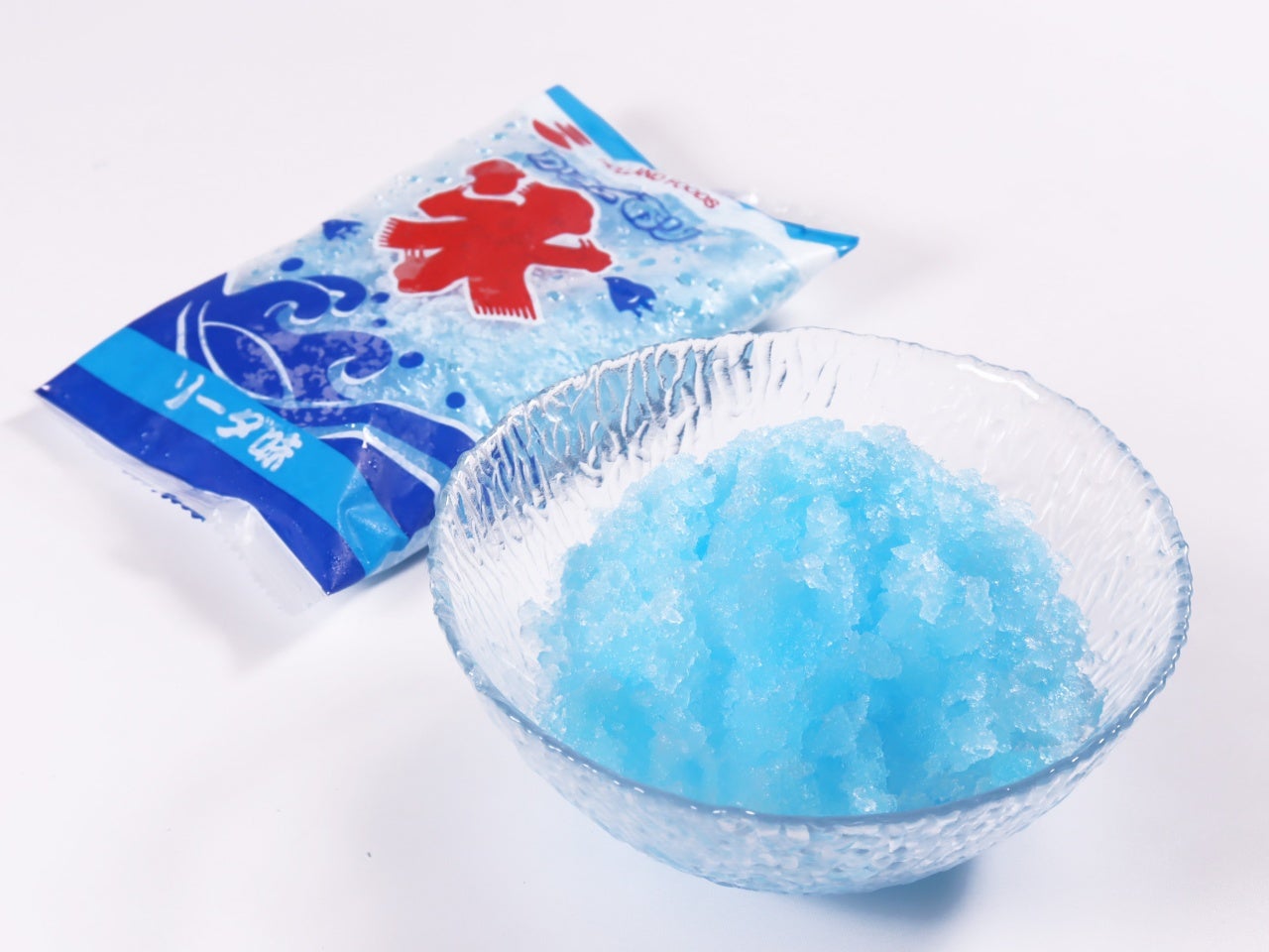 袋入りスタイルのソーダ味かき氷です。1袋135ml入り。直径15cmほどのガラス鉢でふんわり8分目ほどのカサです。