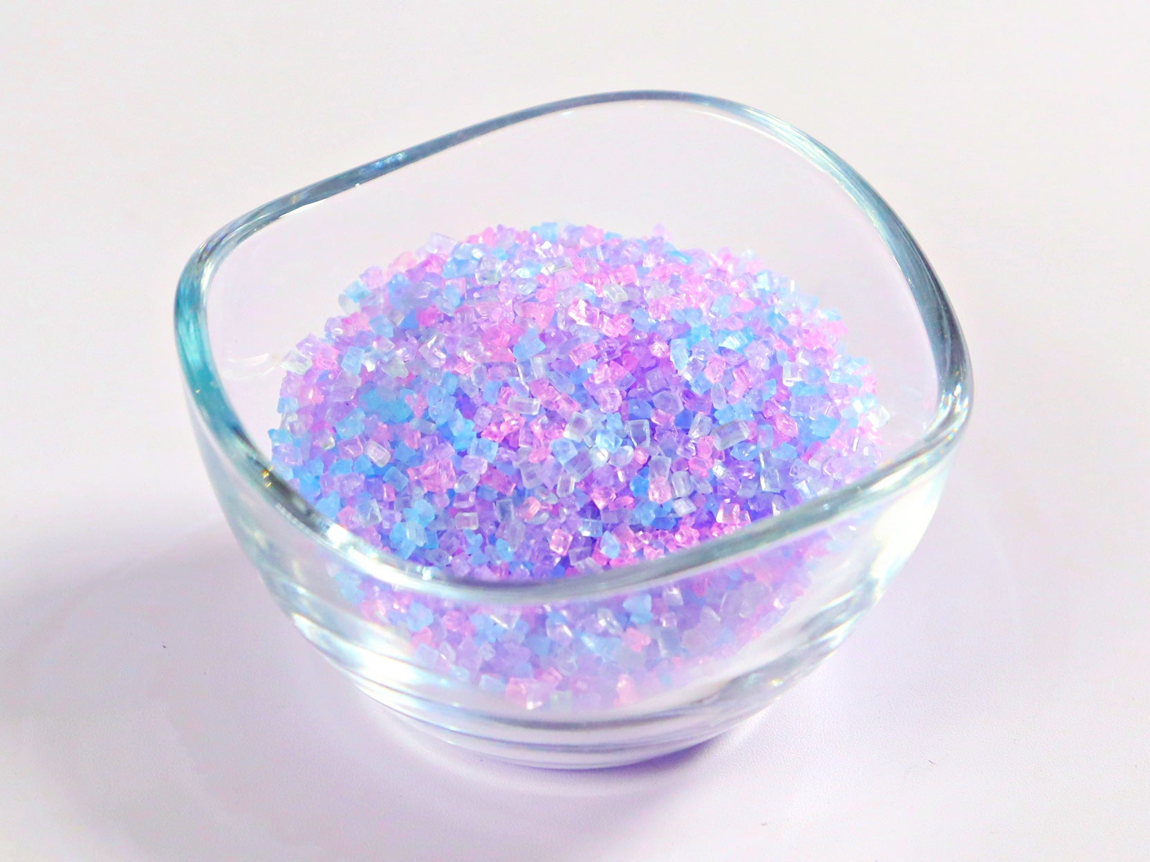 白・ピンク・水色・紫色の4色を混ぜ合わせた、まるで宝石のように輝く砂糖です。ホイップの上に散らすだけでキラキラ!