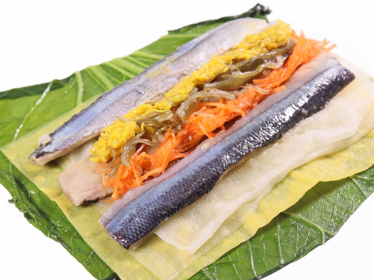 さんまや菊花・人参などの巻き芯を、錦糸卵・広島菜で巻き上げた、色鮮やかな巻物です。