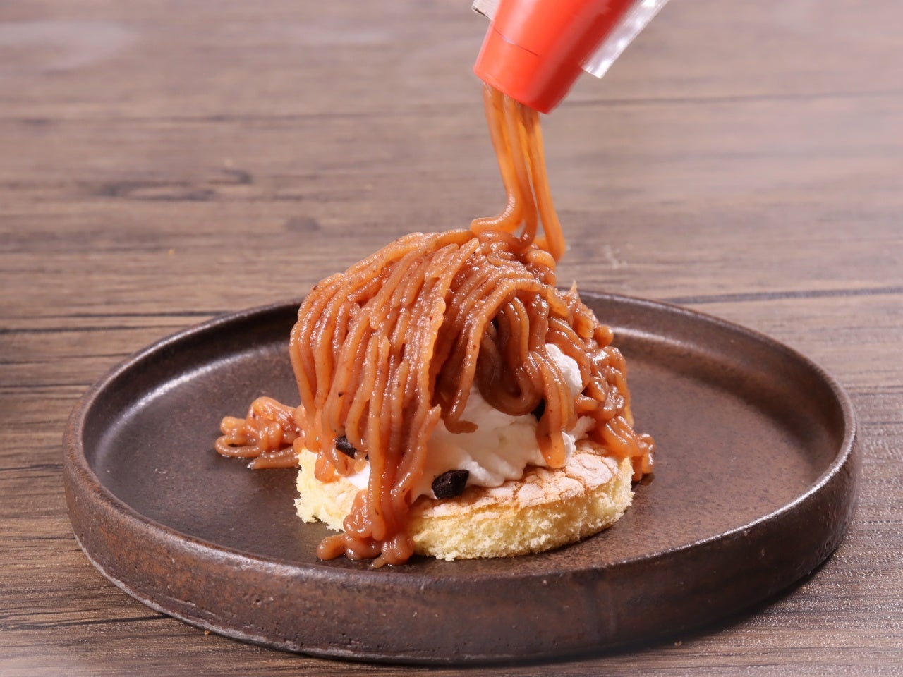 7つ穴の口金からマロンホイップを細ひも状に絞り出せます。ひと絞りするだけであらゆるスイーツをモンブラン仕様にできます