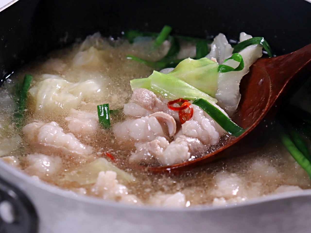 ぷりぷりの王道もつ鍋。仕込みは野菜を切るだけです。