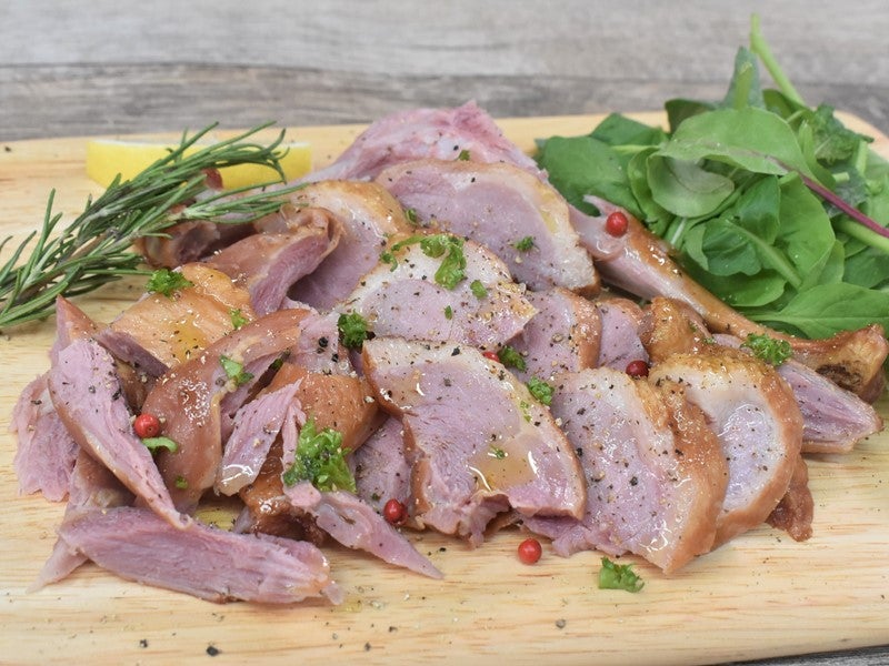 合鴨の骨付きもも肉をしっかりとした燻製の香りのスモークにしました。かぶりつくのではなく、切り分けながらワインなどのお酒と合わせてお楽しみください。1本約180g。