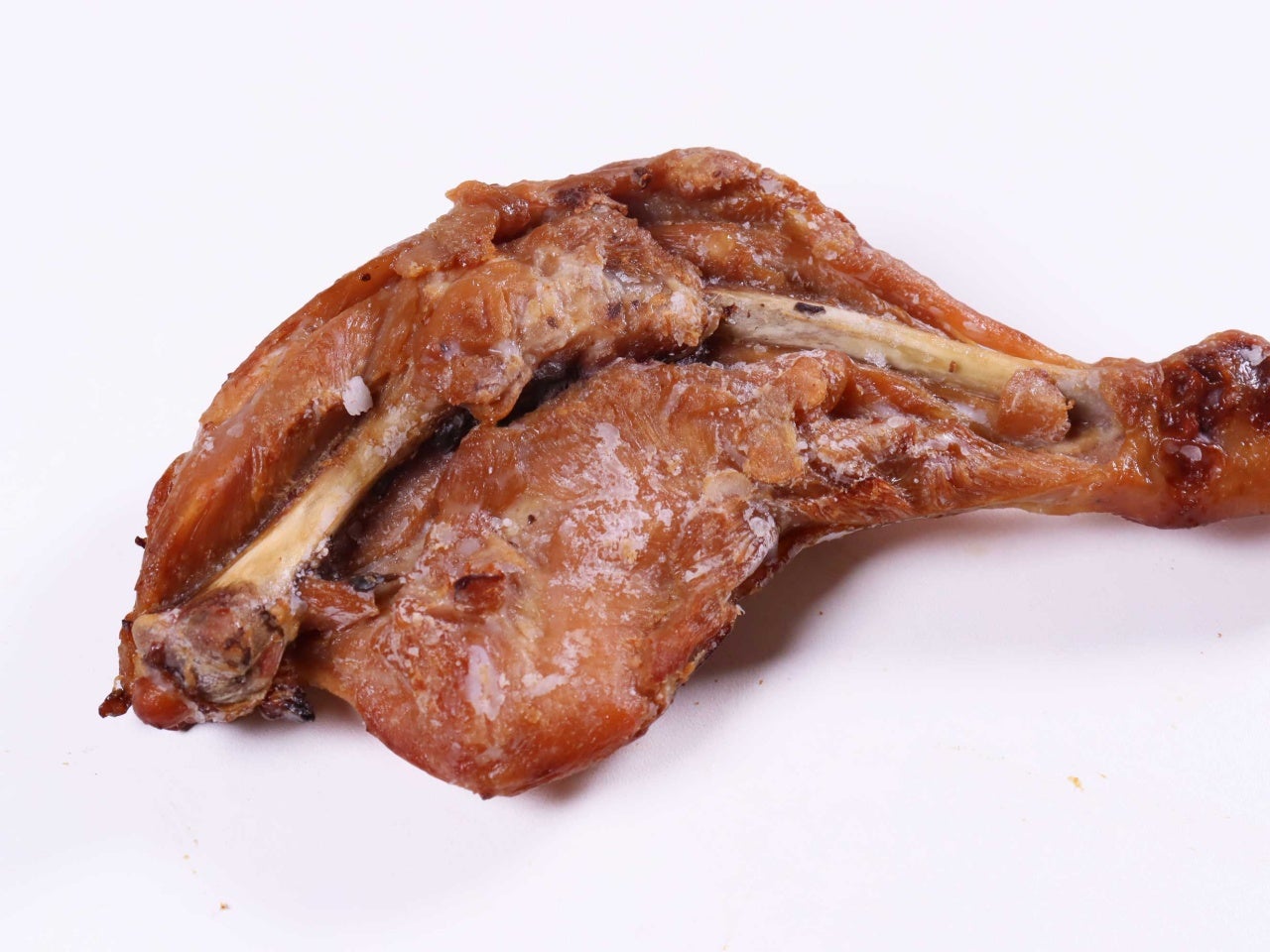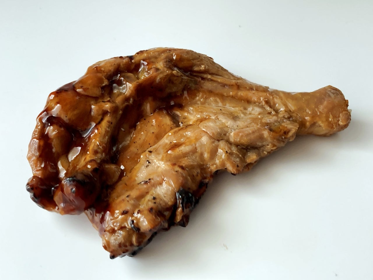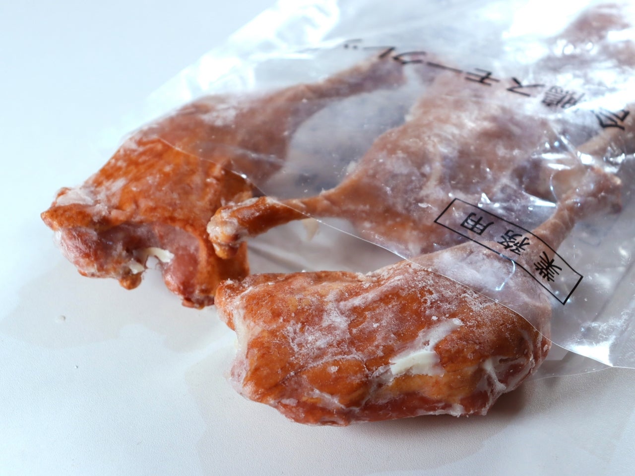 醤油ベースのしっかり味のついた骨付き鶏もも肉のローストです。タレ塗りタイプではなく、バラ凍結になっています。