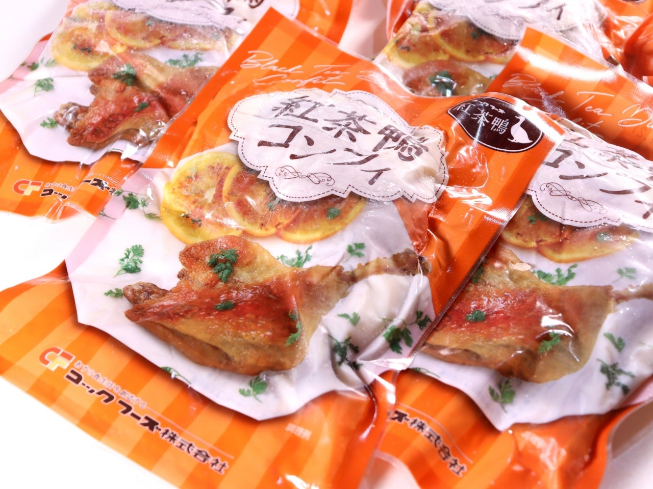 紅茶葉飼料で育てた紅茶鴨の骨付きもも肉に下味を付け、鴨の脂で2時間半~3時間じっくりと煮込み、柔らかな食感に仕上げました。1本約200g。