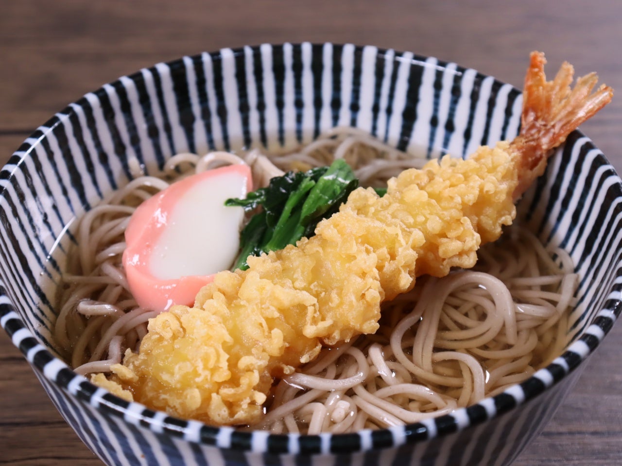 花咲き状の衣、扇状に整えられた尾、大ぶりサイズのえび。おだしによく合う、ふやけすぎないサクサクのえび天。