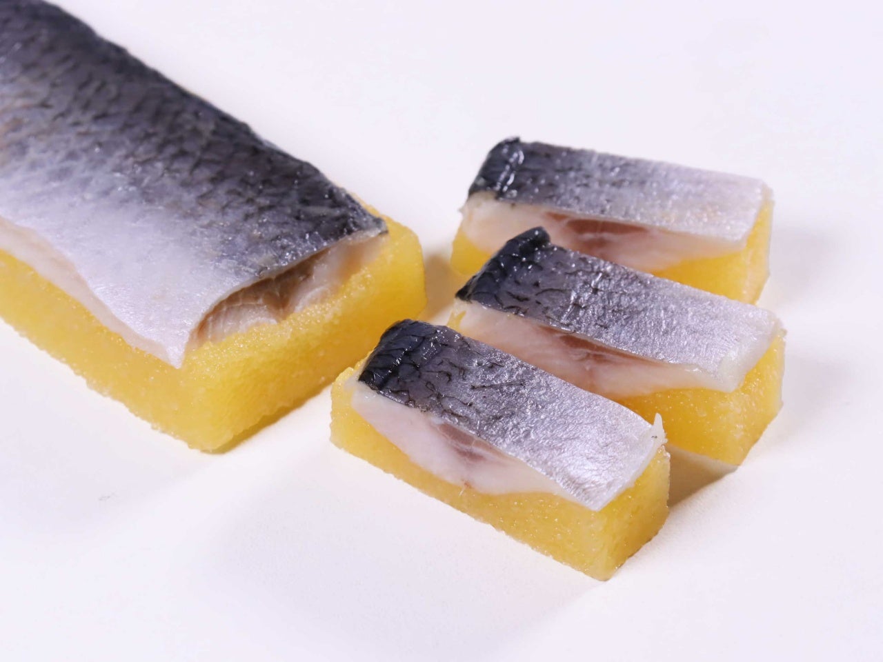 にしんと数の子の「親子」。板状にした数の子に、さっぱりとした酢〆にしんを重ねて切り出しものにしました。