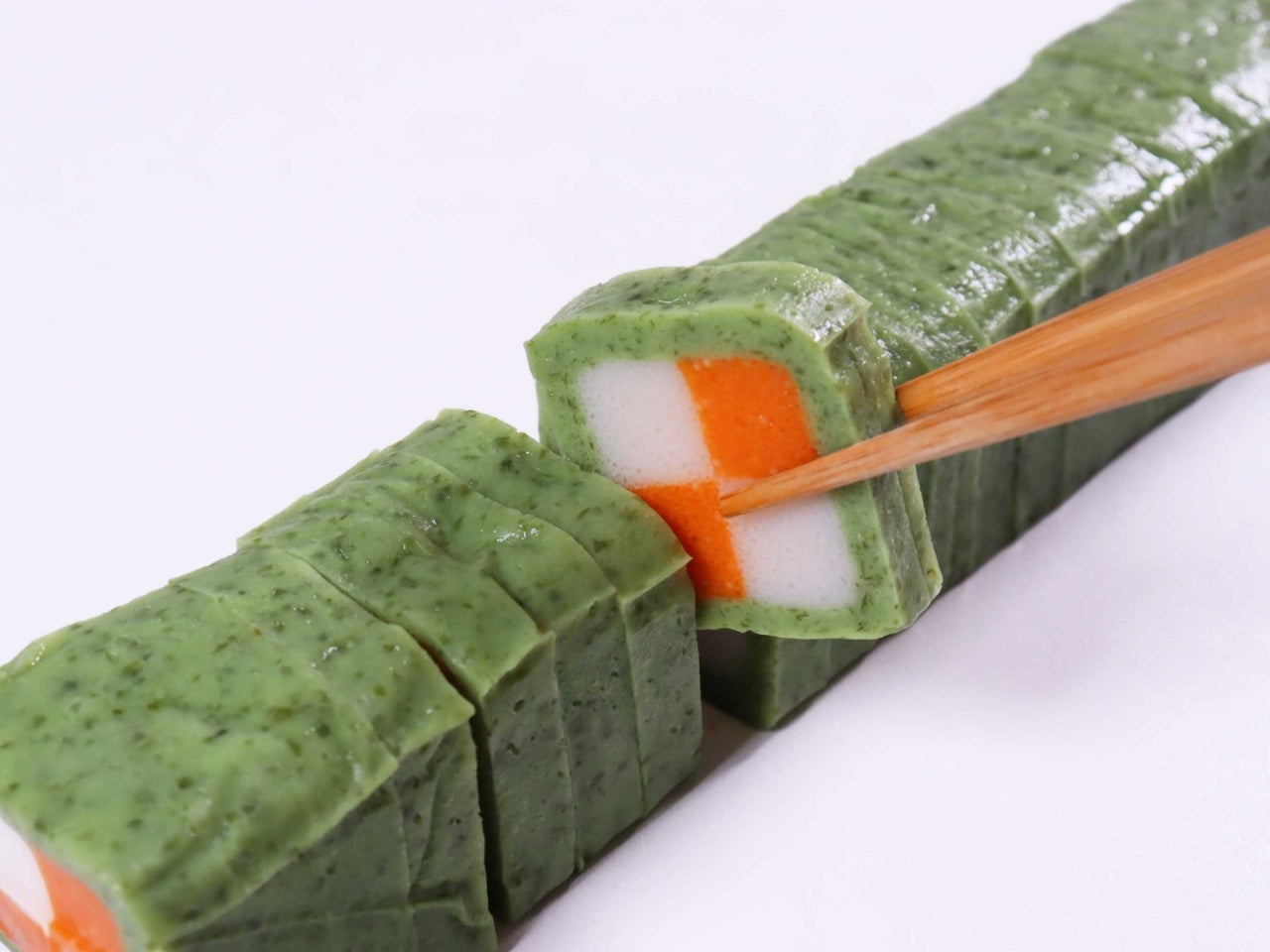 市松模様のかまぼこ惣菜です。外側はあおさの入った緑色、赤い部分には数の子卵を混ぜ込んでいます。