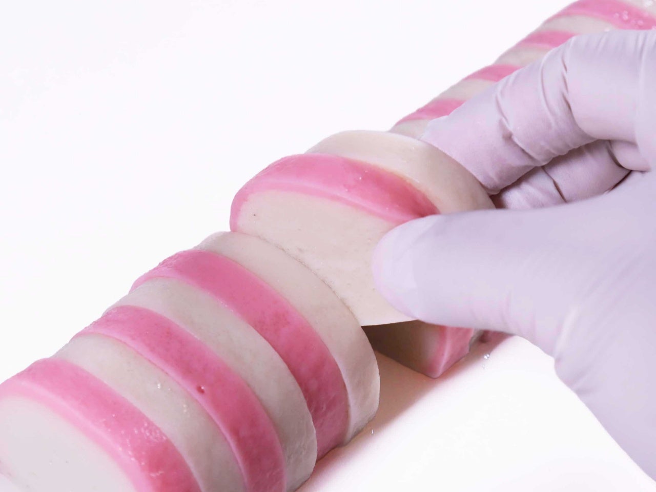 めでたさを表現する紅白のかまぼこ。厚さ約11mm。1本で11組22枚入りです。