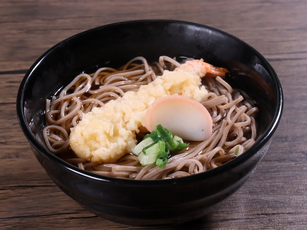 花咲き状の衣、扇状に整えられた尾、大ぶりサイズのえび。おだしによく合う、ふやけすぎないサクサクのえび天。