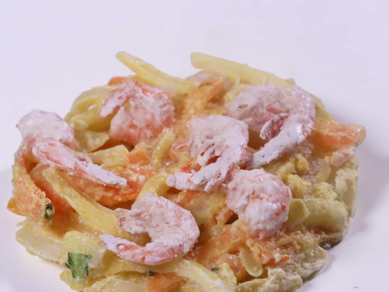 たまねぎ・にんじん・じゃがいも・春菊に、香ばしい殻付き小えびを6尾のせました。
