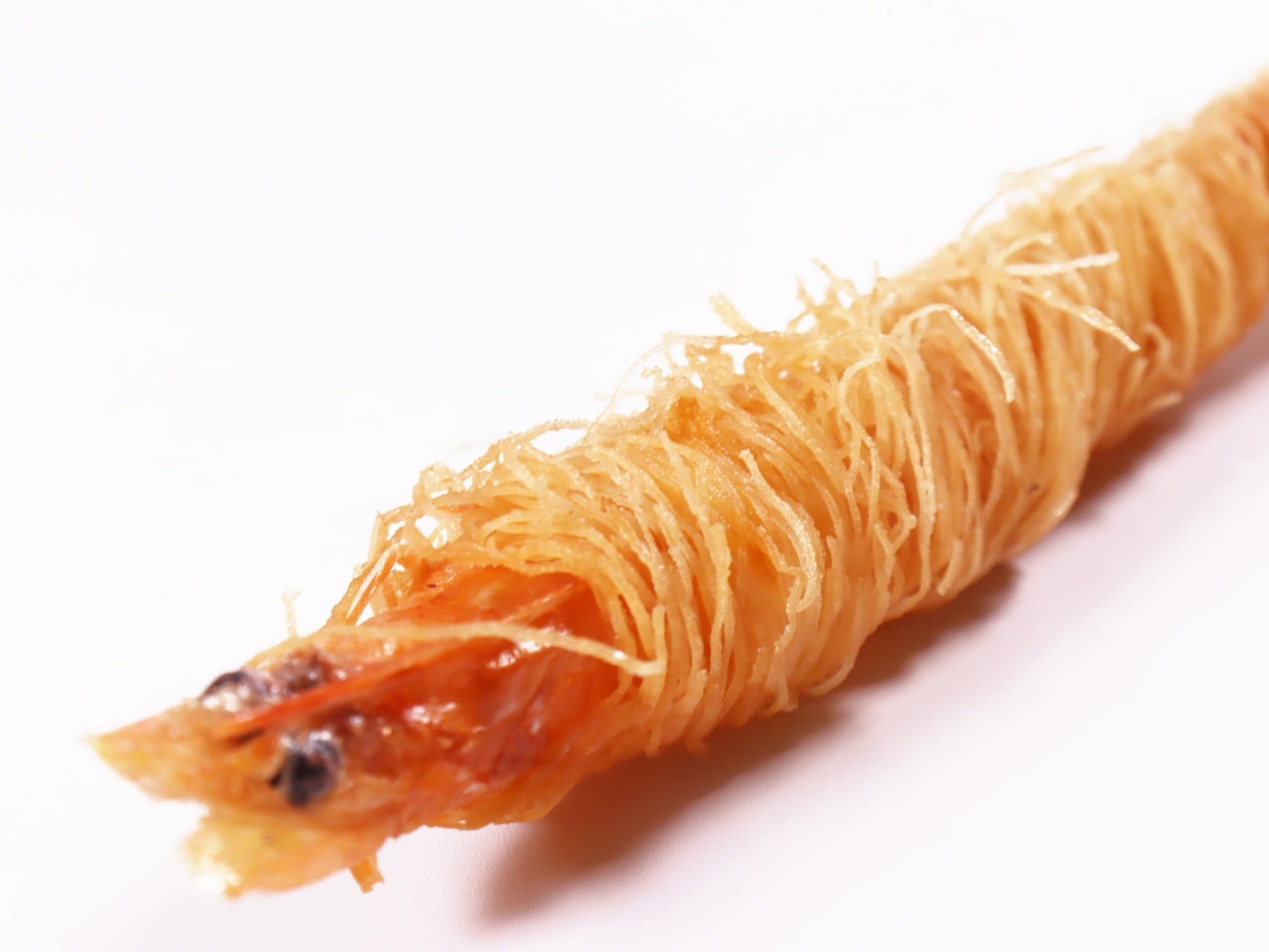 下処理を施した有頭むきえびに、「天使の髪」とも呼ばれる麺状の衣であるカダイフを一つ一つ丁寧に巻きつけました。えびとカダイフの絶妙なバランスにこだわり、美味しさを最大限に引き出す比率で仕上げました。油で揚げるだけで、思わず目を引く一品が完成します。