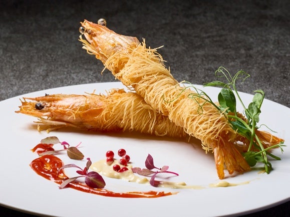 「エンジェルヘア(天使の髪)」とも呼ばれるカダイフを巻いた美しいえびフライ