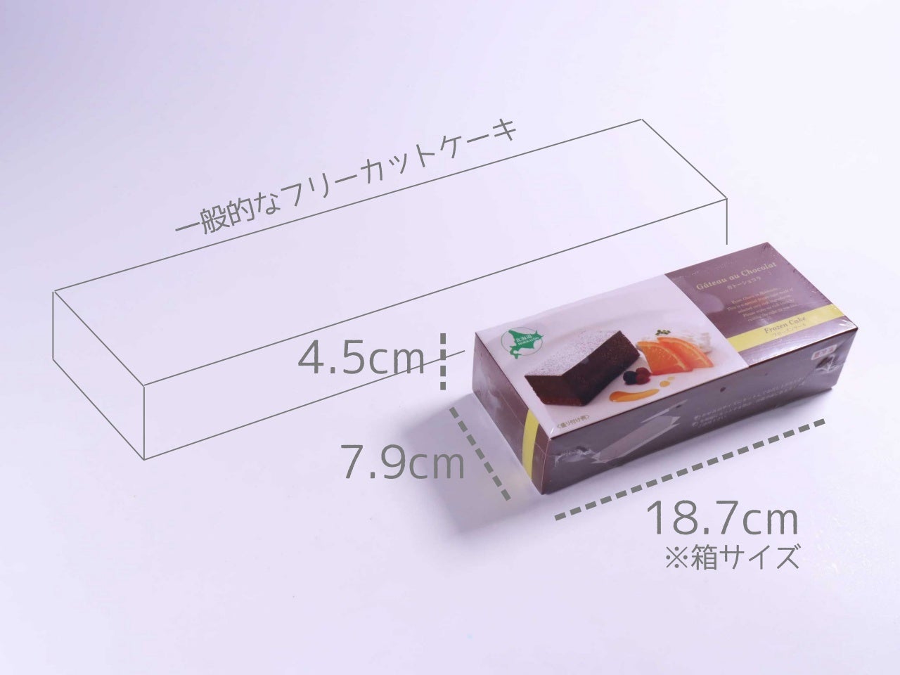 一般的なフリーカットケーキの半分の長さ。冷凍庫/冷蔵庫でストックしやすくコンパクト。