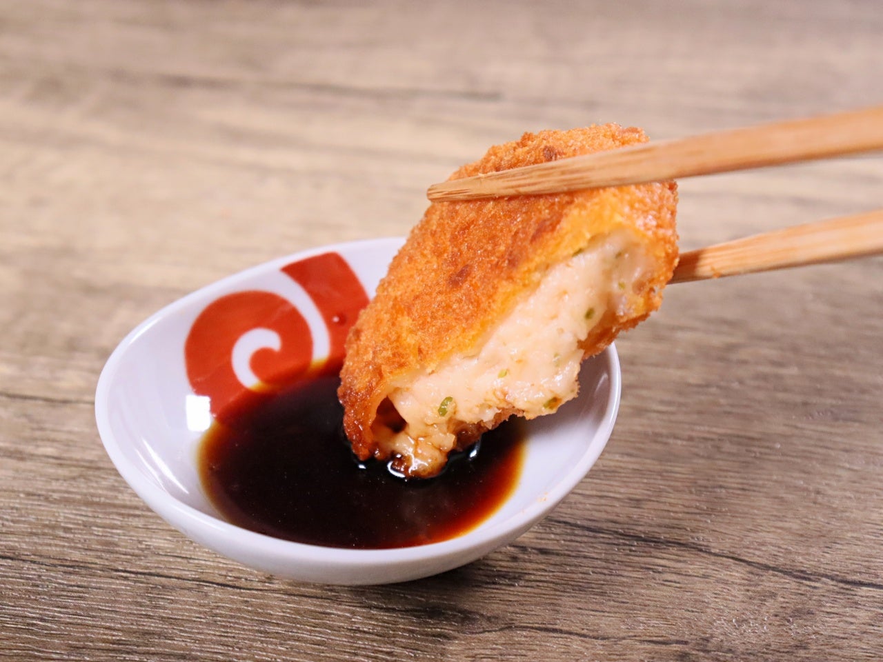 ほんのりピンク色。桜えびとあおさのりを入れた、海の香りのえびクリーミーコロッケです。直径約7cm。