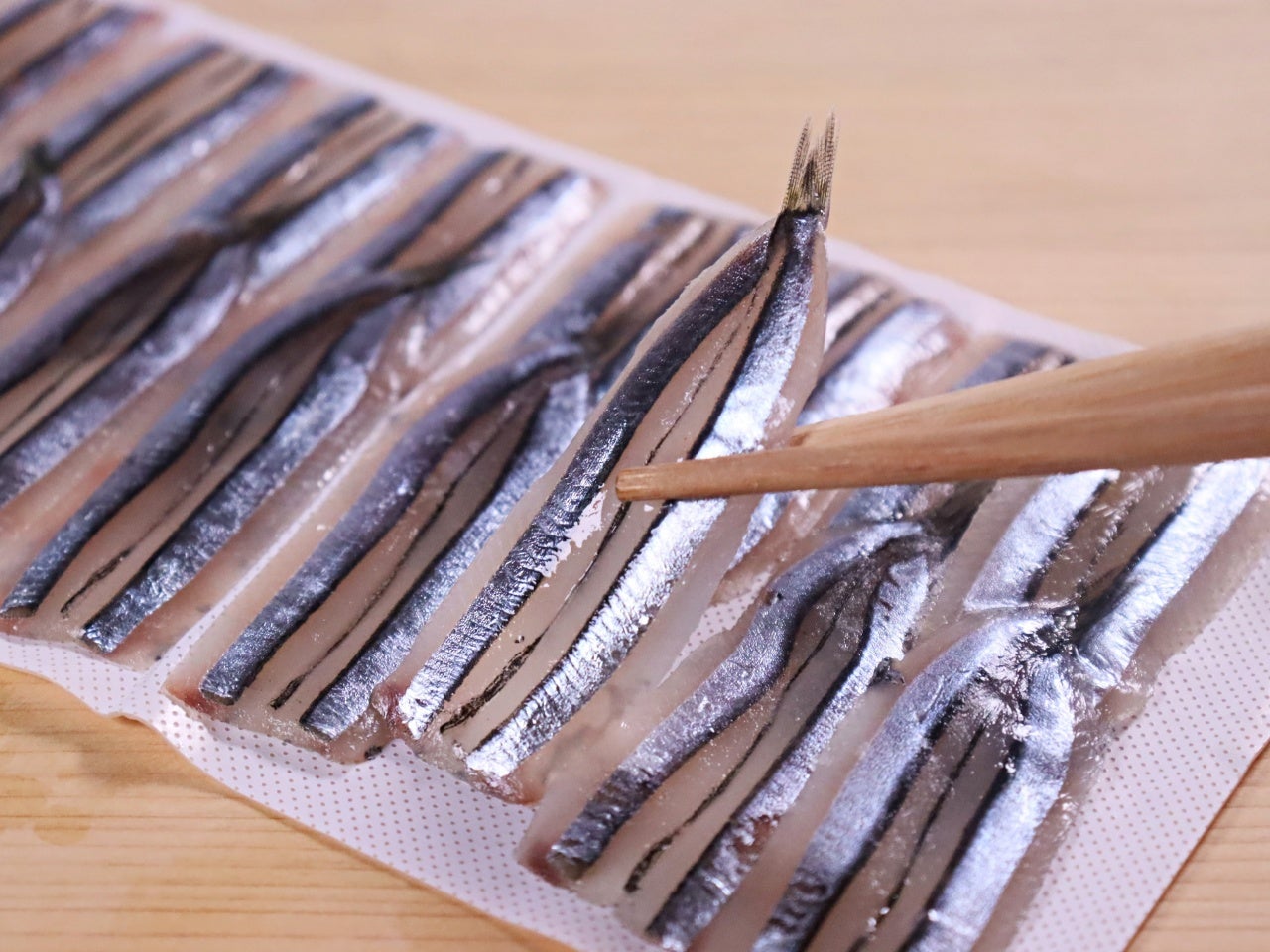 中心は生のままのピンク色。長さ35~40cmほどの背・腹が各1本ずつ。