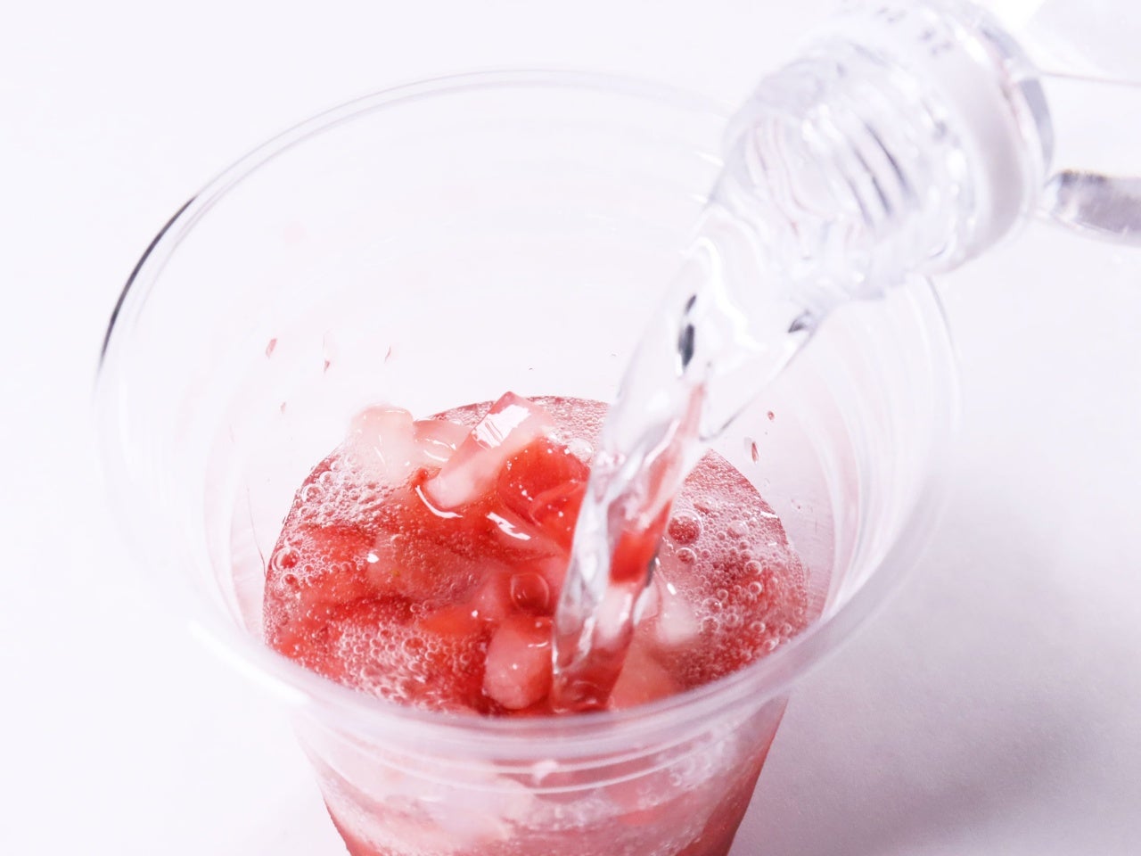 ③シンプルに炭酸水を加えるだけでもおいしい!冷凍果実のシャリシャリしたドリンクが楽しめます。無味・無糖のソーダなどは約180mlが目安、甘いドリンクで作る場合はお好みの量で。