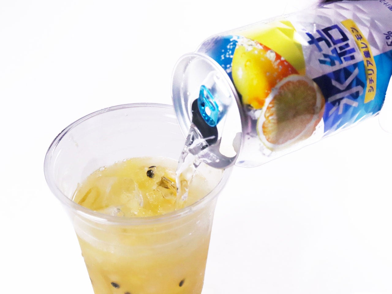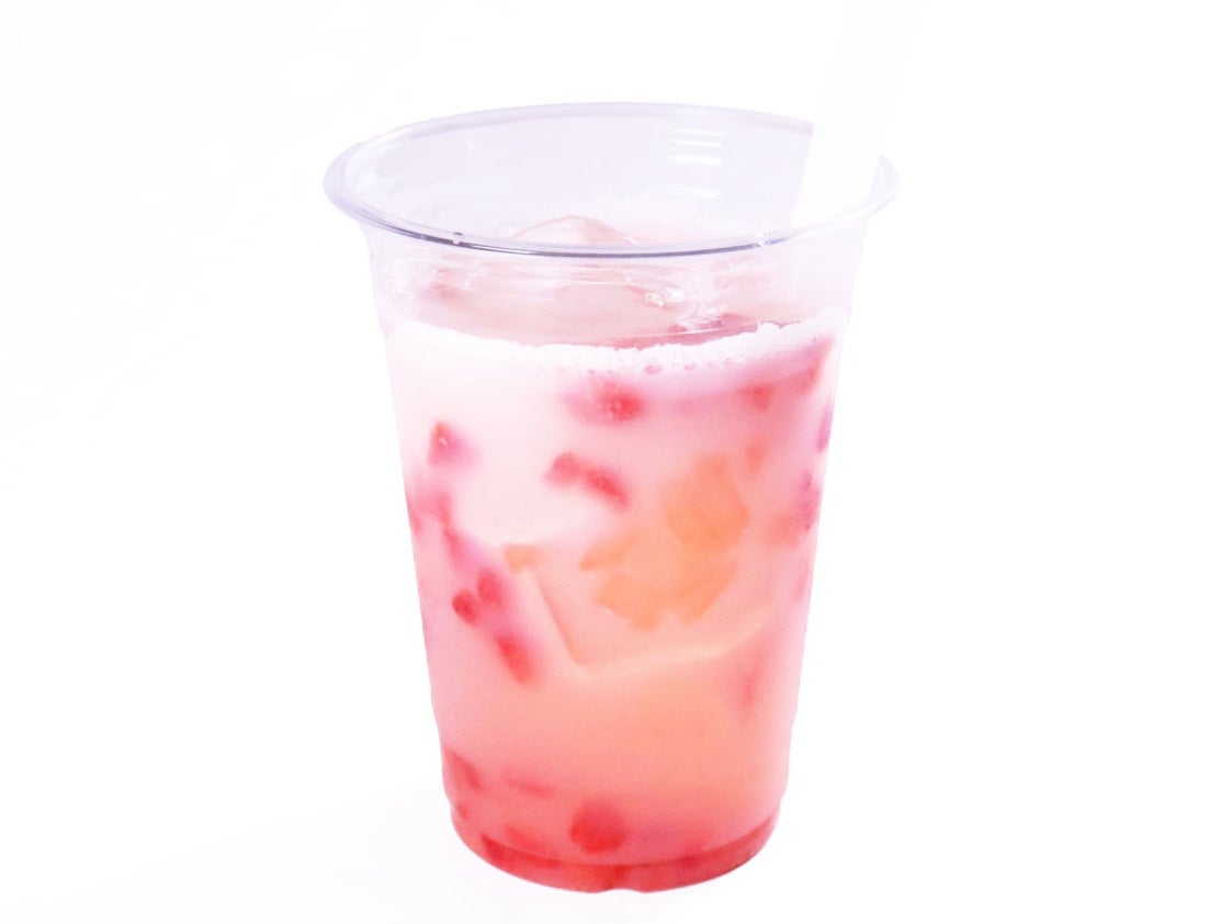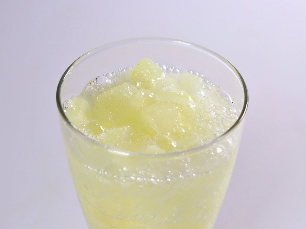 炭酸水を加えるのが一番シンプルな作り方。すっきりとした酸味にたっぷりの果実が香る、クリアなナタデココドリンクになります。