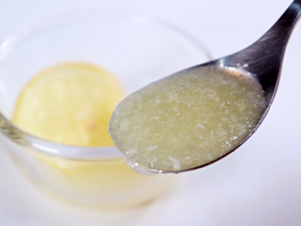 ③かき混ぜれば、白濁したあらごしレモネードのできあがりです。(凍ったレモンスライスにピューレが張り付いている場合があります。)