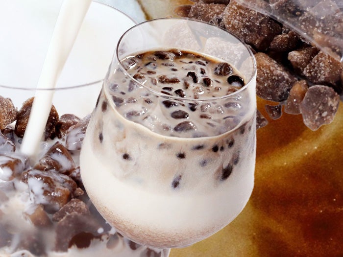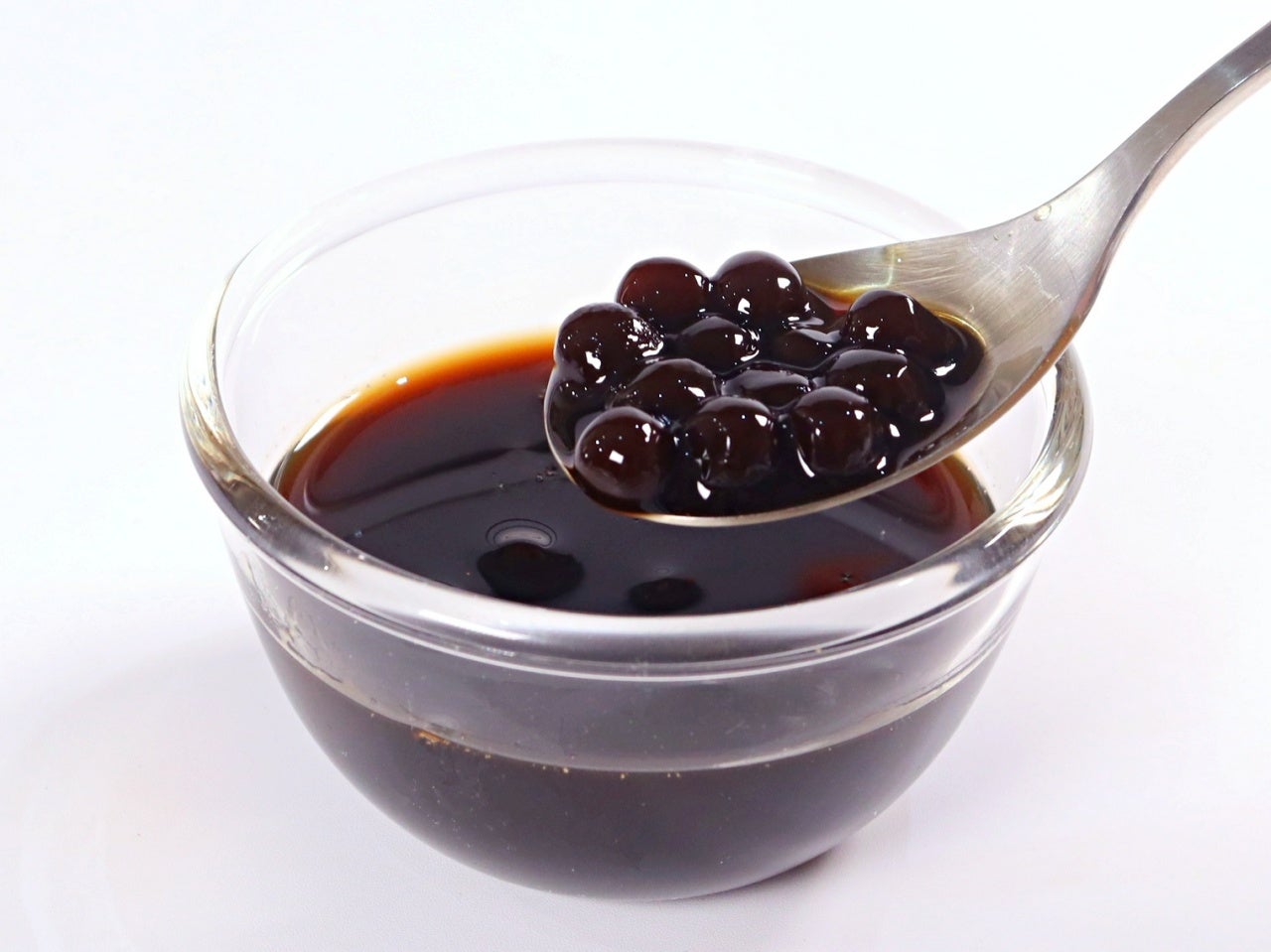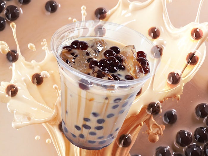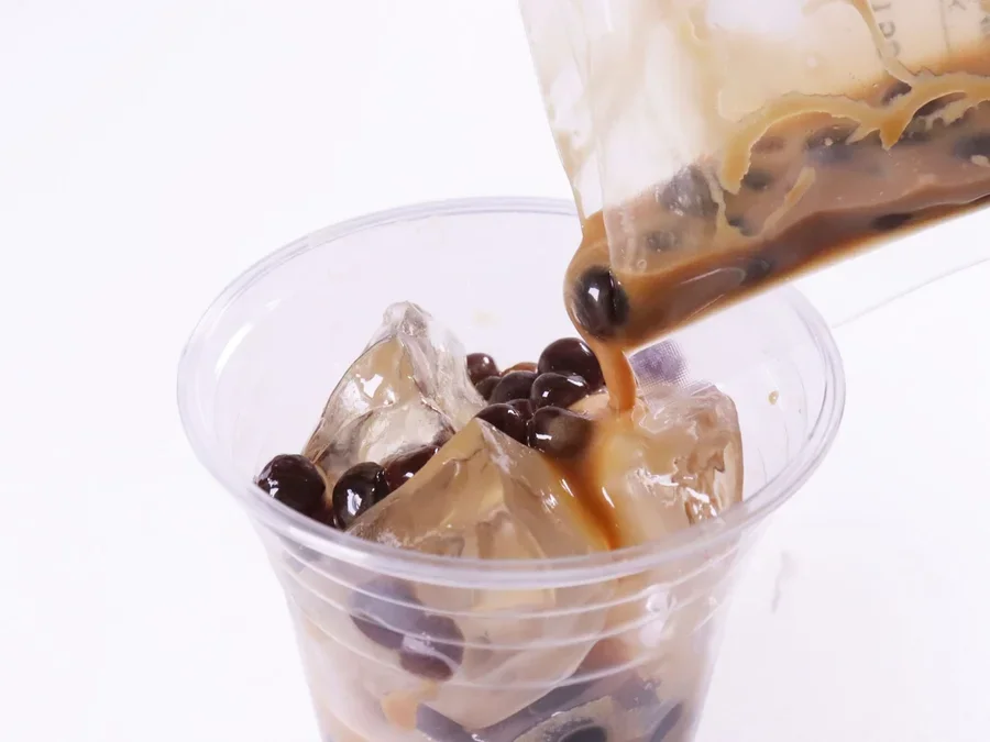 茹で済み・味付きのブラックタピオカと濃縮シロップにミルク成分(乳たんぱく)を加えています。